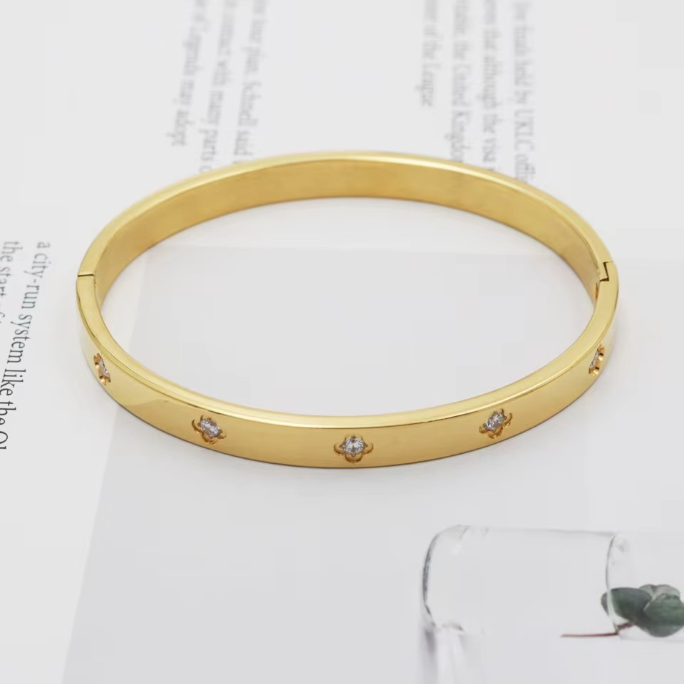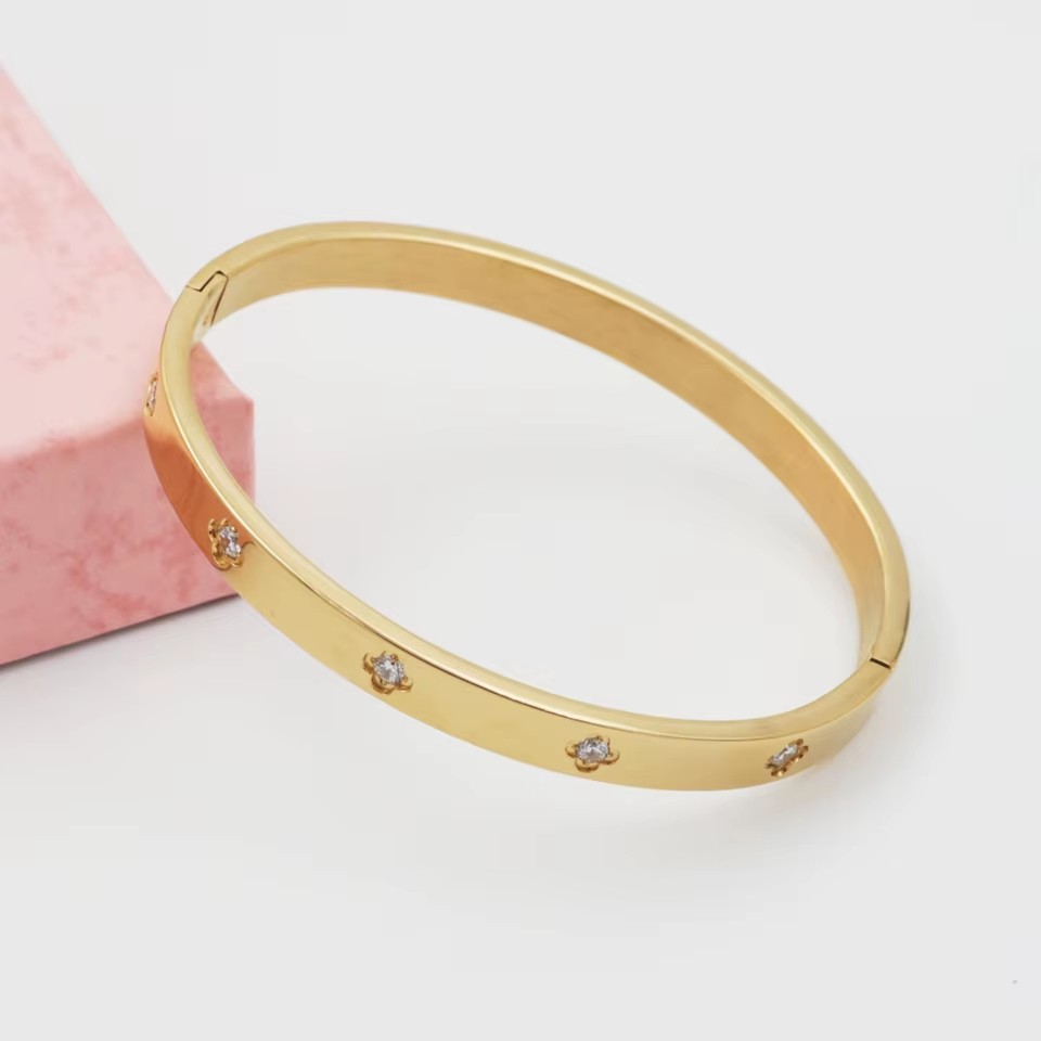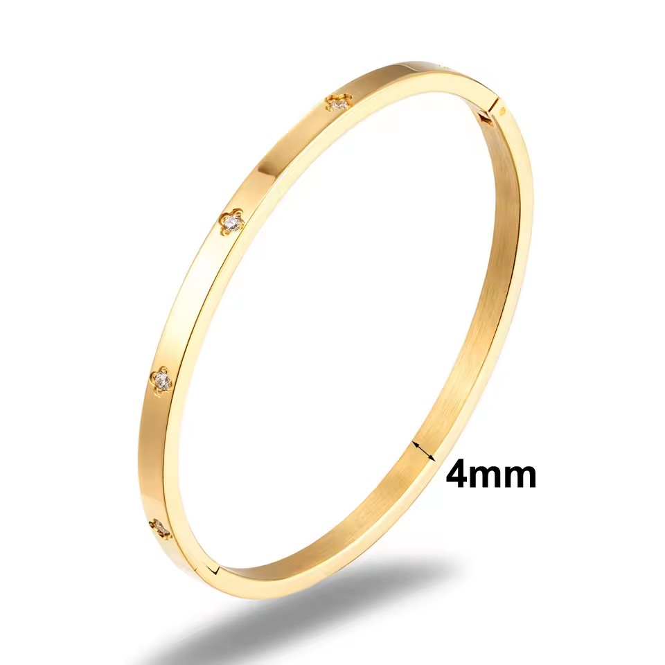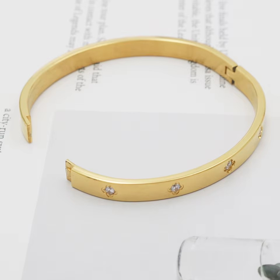 The Liora bangle is a delicate harmony of warmth and brilliance. It is sleek and wraps gracefully around the wrist, catching the light with every movement. Embedded with shimmering silver-toned gemstones, each stone reflects a soft glow like stardust scattered across a night sky. Paired perfectly with any bracelet.